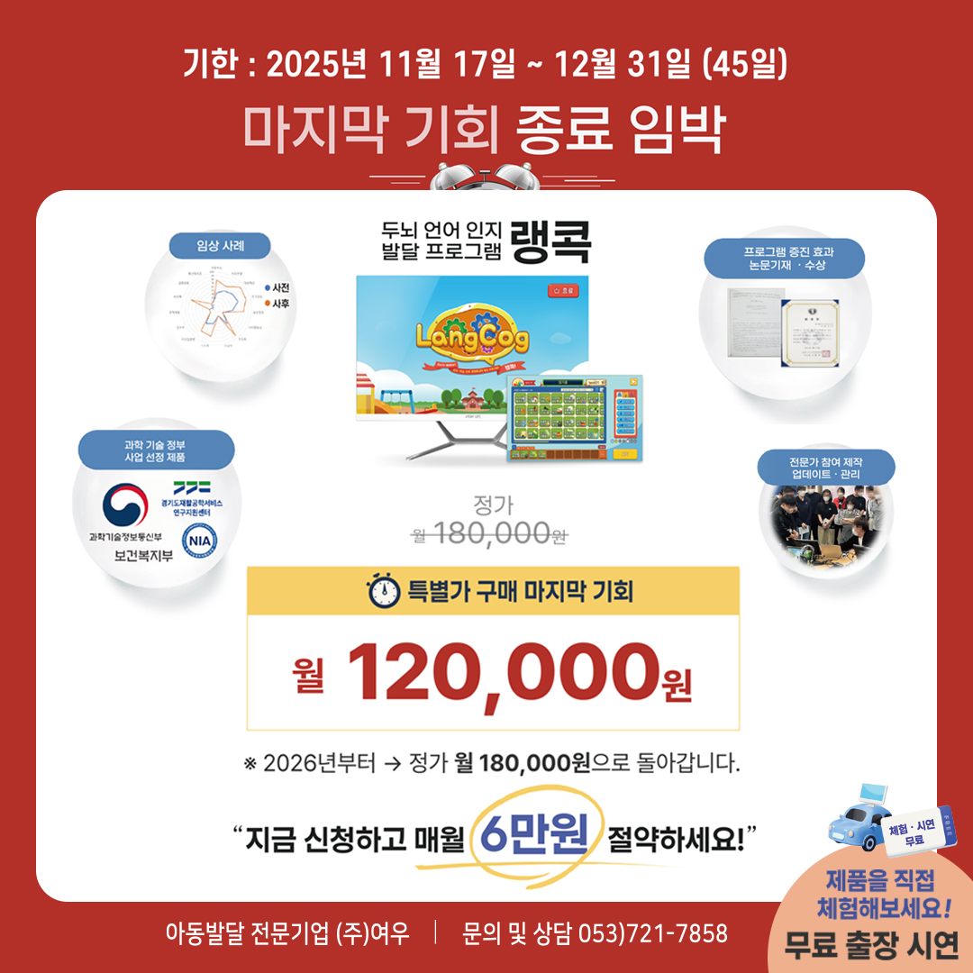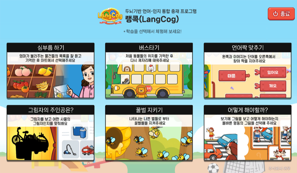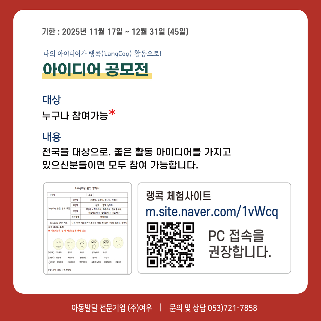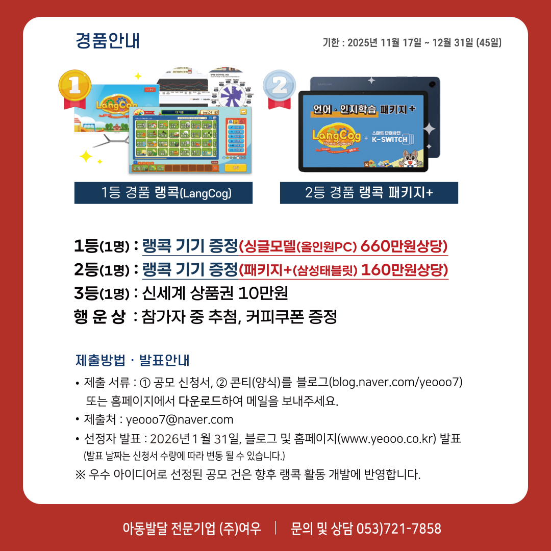 랭콕(LangCog)을 사랑해주시는 많은 고객님들께 감사의 마음을 담아, 2025 하반기 이벤트를 실시합니다. 기간은 : 2025년 11월 17일 ~ 12월 31일이며, 아래는 아이디어 공모전 안내입니다. 아이디어 공모전은 누구나 참여가능합니다. 공모전 제출 서류는 (1)공모 신청서와 (2)콘티(LangCog 활동 계획서 양식)를 다운받아 yeooo7@naver.com으로 보내주시면 됩니다. 예시 콘티로 개발된 랭콕(LangCog) 활동을 체험판을 해보실 수 있습니다. 선정자 발표는 2026년 1월 31일 블로그(blog.naver.com/yeooo7) 혹은 여우 홈페이지를 통해 발표합니다. (발표 날짜는 신청서 수량에 따라 변동 될 수 있습니다.)